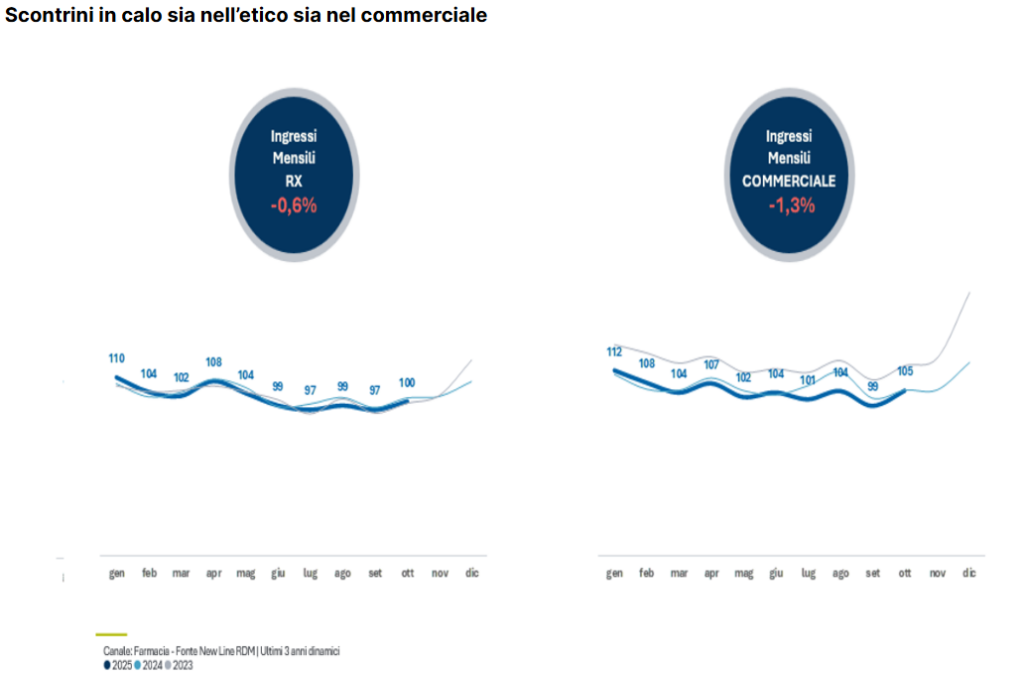 Questi numeri arrivano dall’analisi degli ingressi in farmacia che New Line Ricerche di Mercato ha portato alla terza edizione di Scanner Orizzonti, il forum della farmacia organizzato a Milano da Pharmacy Scanner. Il calo, ha spiegato Viki Nellas, R&D lead di New Line, è generalizzato e riguarda tanto gli ingressi che hanno come driver l’etico (-0,6% nei primi dieci mesi del 2025), quanto quelli guidati da acquisti dell’area commerciale (-1,3%).