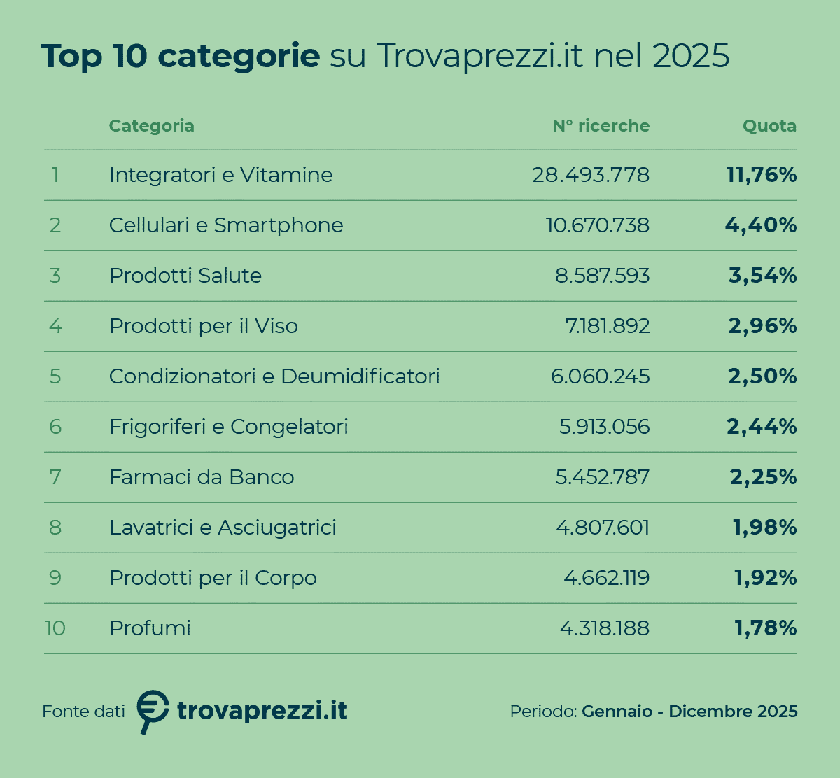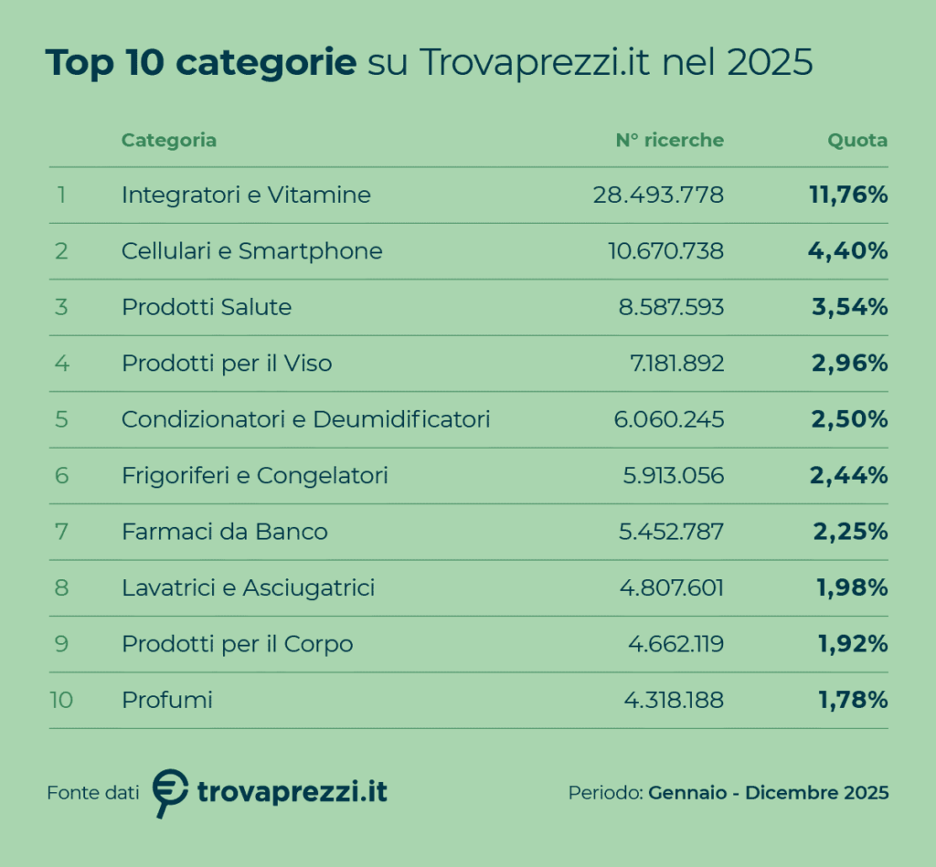 «I dati del 2025 descrivono un consumatore meno influenzabile dalle mode e più attento al valore reale delle scelte», commenta Dario Rigamonti, CEO di Trovaprezzi. «Il podio delle categorie resta in continuità con il 2024, ma cambiano in modo significativo i volumi e le motivazioni d’acquisto. La crescita strutturale della salute e una maggiore prudenza verso la tecnologia indicano un passaggio chiaro: la comparazione evolve da semplice leva di risparmio a strumento per decisioni più informate e coerenti con i propri bisogni».