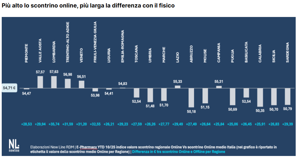Indubbio, dice infine l’analisi di New Line, l’effetto drenante che l’e-commerce ha esercitato nel 2025 sugli ingressi nelle farmacie fisiche. «Le politiche di prezzo praticate dall’online sui prodotti utilizzati in modo più continuativo» è la valutazione di Viki Nellas «inducono il consumatore a fare scorta per risparmiare». Lo conferma un raffronto su base regionale tra il valore dello scontrino medio delle farmacie digitali e quello delle farmacie fisiche: a una maggiore penetrazione dell’e-commerce, corrisponde una differenza più marcata tra l’uno e l’altro. Ed ecco allora un altro dato su cui è opportuno meditare.