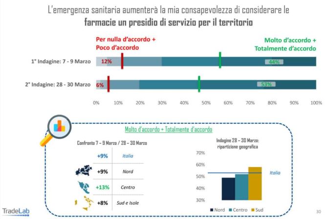 Si tratta di un dato molto significativo che emerge dalla ricerca, cresce infatti la richiesta di una maggiore diffusività dei servizi sanitari e l’attesa di vedere assegnato un ruolo maggiore alle farmacie sul territorio (la metà del campione – in crescita di 9 punti – si dichiara fortemente propenso a questa soluzione).