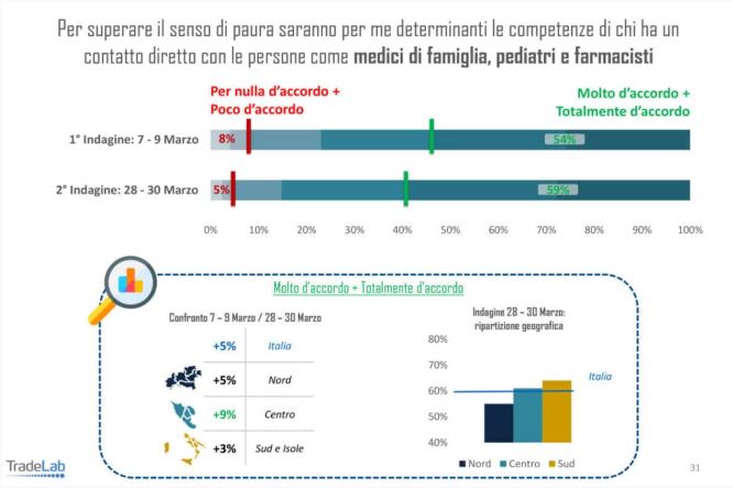 Cresce inoltre (+ 5 punti percentuali) l’attesa di un ruolo più rilevante degli stessi farmacisti e dei medici (e pediatri) di famiglia anche sul piano dell’informazione (quasi il 60% del campione). Per quanto riguarda questi due dati sul coinvolgimento di farmacisti e medici sul territorio si evidenzia una maggiore sensibilità al Sud dove probabilmente è più sentita già oggi l’esigenza di presidio rispetto alla capacità, in termini di dotazioni di strutture, organizzazione e risorse, delle strutture (pubbliche).