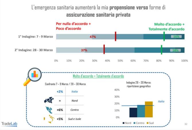 «Quest’ultima riflessione può essere confermata dalla relativamente maggiore propensione al Sud (23%) verso il ricorso futuro a forme di assicurazione sanitaria privata che nel complesso rimane comunque limitata al 18% del campione nazionale».