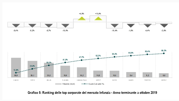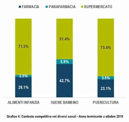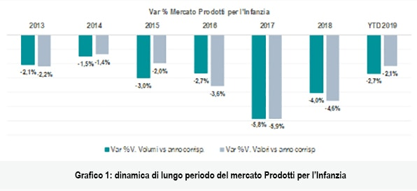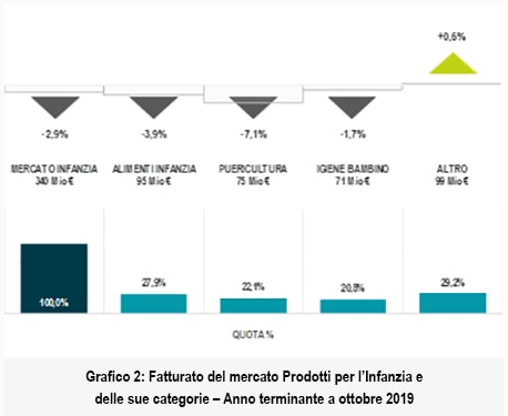 Nell’anno terminante a ottobre 2019 il mercato ha complessivamente registrato un decremento del 2,9 per cento a valori e del 3,1 a volumi, generando un fatturato complessivo di 340 milioni di euro e 60 milioni di confezioni vendute.Le tipologie di prodotti che costituiscono il mondo infanzia sono gli Alimenti per l’infanzia, che rappresentano il 27,9 per cento del giro d’affari complessivo, la Puericultura, che contribuisce invece per il 22,1 per cento e l’Igiene bambino, che sviluppa il 20,8 per cento del fatturato totale, mentre il restante 29,2 per centoi è costituito da Altri prodotti per l’infanzia (referenze appartenenti all’automedicazione e sanitari pediatrici).