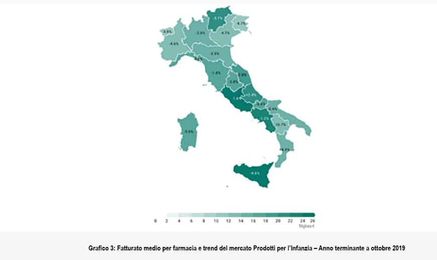 Il mercato dei prodotti per l’infanzia in farmacia sembra quindi più dinamico e rilevante nel Centro e nel Sud Italia. Questa dinamica potrebbe essere legata a diversi fattori. In prima battuta potrebbe essere rilevante l’aspetto culturale, che porta le persone che vivono in questa area ad avere una maggiore fiducia nella farmacia come presidio territoriale della salute e della cura a 360°. In secondo luogo, e di conseguenza, la farmacia stessa potrebbe avere un diverso posizionamento rispetto a questo mercato e gestire quindi una differente tipologia di offerta rispetto al punto vendita medio del Nord. Infine, un altro aspetto da tenere in considerazione è sicuramente la minore presenza della grande distribuzione organizzata in queste zone.