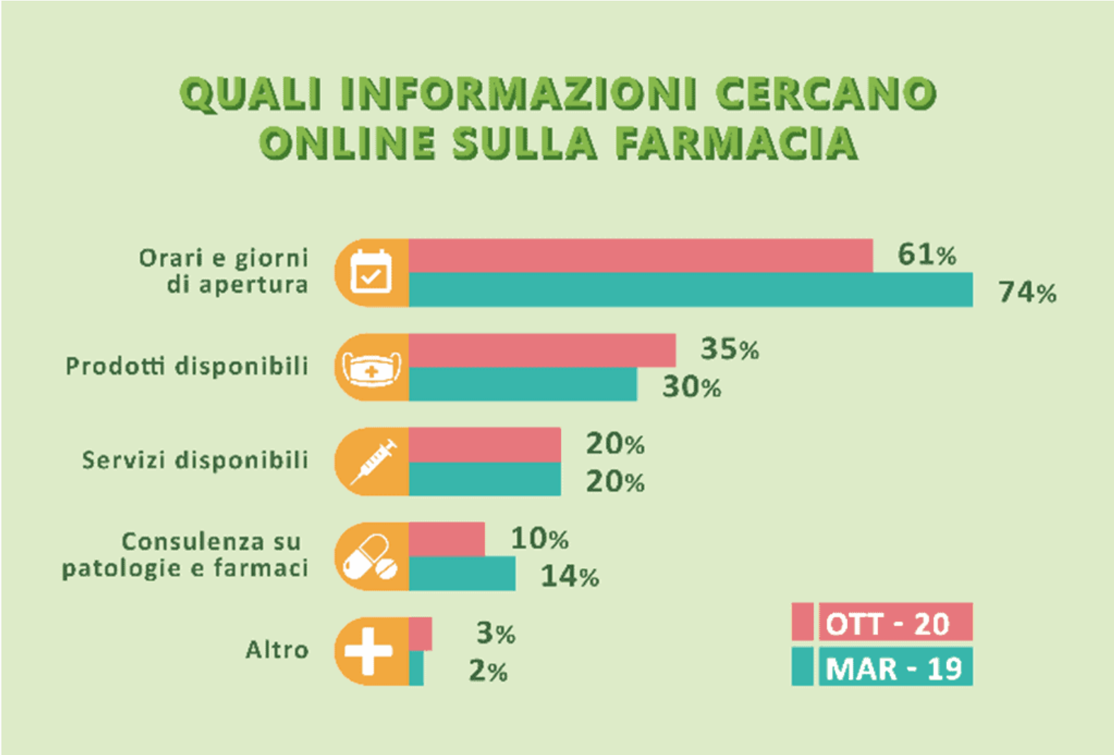 Dal report dell’Istituto Piepoli risulta che confrontando i dati di oggi a un anno e mezzo fa, il 25% tra coloro che cercano informazioni online, lo fa sempre meno per avere notizie su orari e giorni di apertura (la percentuale è infatti passata dal 74% al 61%) ma rispetto a prima cresce la percentuale di chi vuole conoscere i prodotti disponibili (dal 30% al 35%). In diminuzione anche la ricerca di consulenza su patologie e farmaci (dal 14% al 10%).