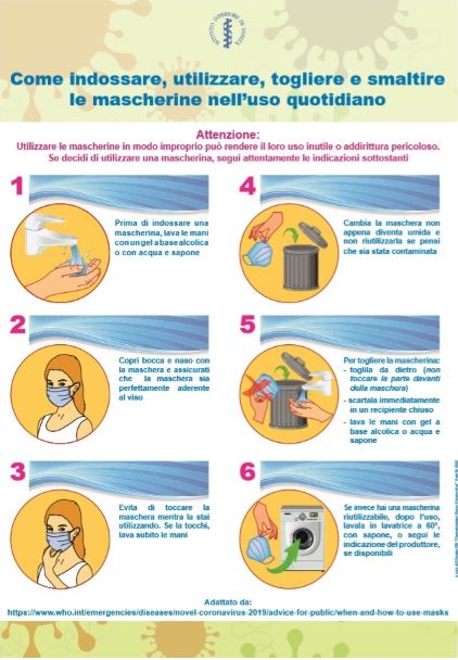 Le mascherine rappresentano una misura complementare per il contenimento della trasmissione del virus e non possono in alcun modo sostituire il distanziamento fisico, l’igiene delle mani e l’attenzione scrupolosa nel non toccare il viso, il naso, gli occhi e la bocca.